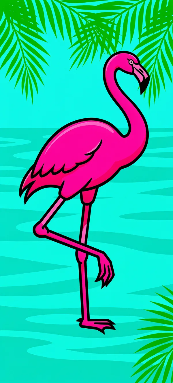 Bold and bright tropical graphic wallpaper featuring a stylized pink flamingo against turquoise water with graphic palm design. High-resolution artistic phone background.