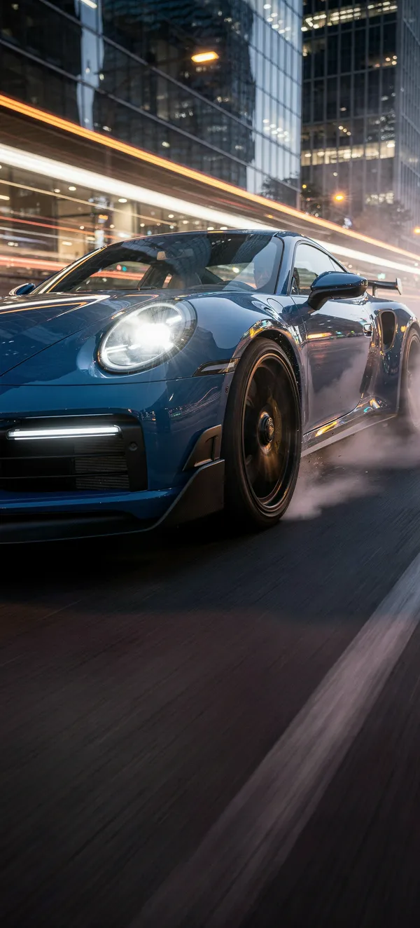 CarsHigh-resolution Porsche 911 Turbo S 992 in stunning Shark Blue, launching with launch control on urban boulevard. Premium automotive wallpaper for car enthusiasts.