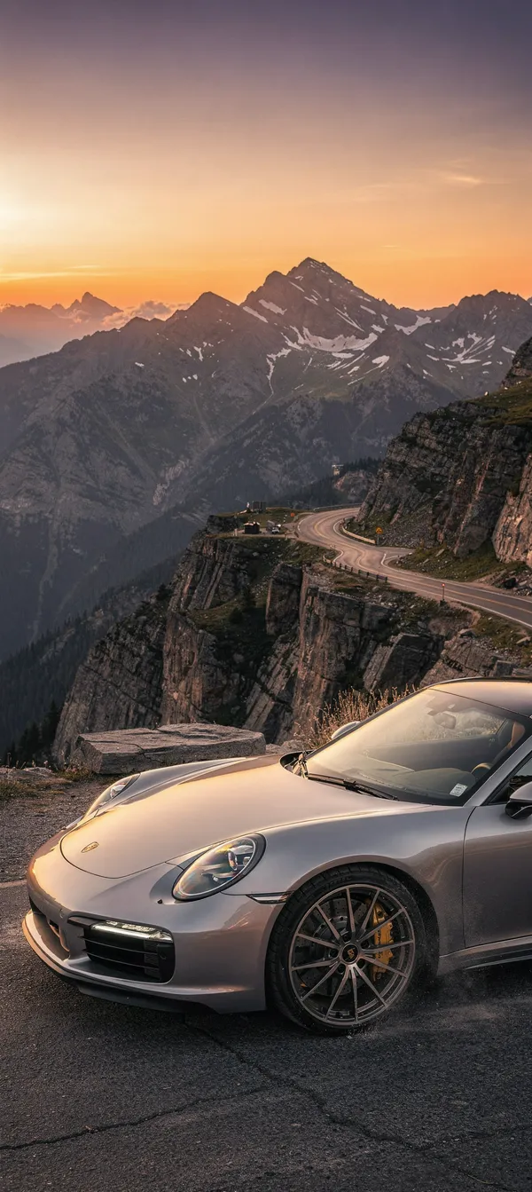 CarsUltra-detailed silver Porsche 911 Turbo wallpaper with dramatic sunset mountain backdrop. High-resolution automotive photography for car enthusiasts.