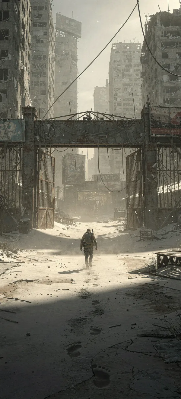GamingImmersive post-apocalyptic landscape phone wallpaper featuring a lone wanderer exploring a haunting, dust-covered abandoned cityscape with epic scale and atmospheric detail.