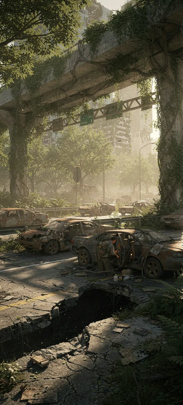 GamingImmersive post-apocalyptic scene with overgrown highway, rusted vehicles, and atmospheric urban decay. High-quality 4K mobile wallpaper for dystopian art lovers.