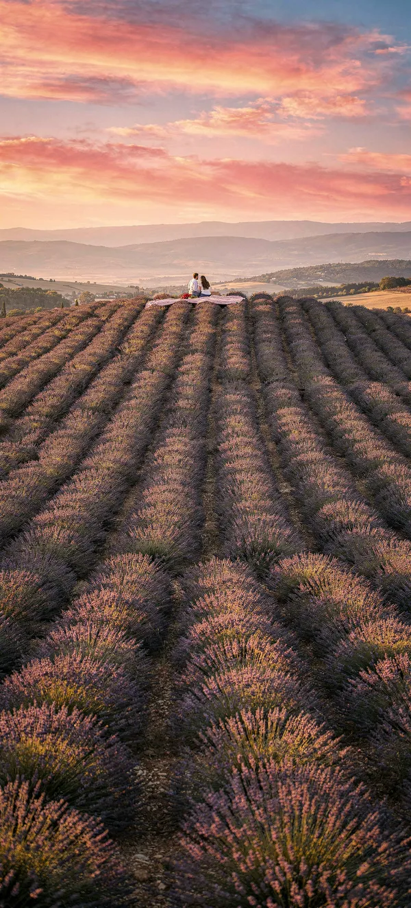 Dreamy lavender field sunset wallpaper featuring a romantic couple silhouetted against pink and gold sky. High-quality landscape phone background.