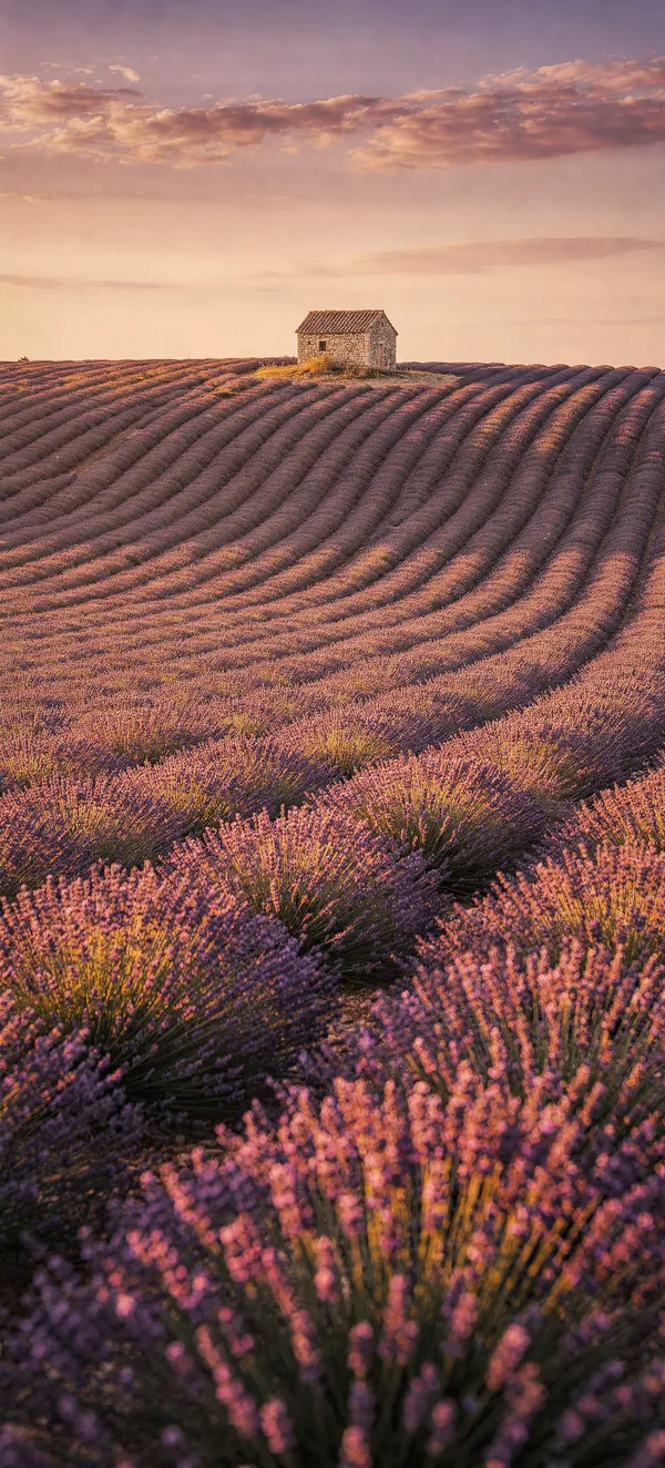 Immerse your screen in the breathtaking beauty of Provence with this stunning sunset lavender field wallpaper, featuring golden light and vibrant purple hues.