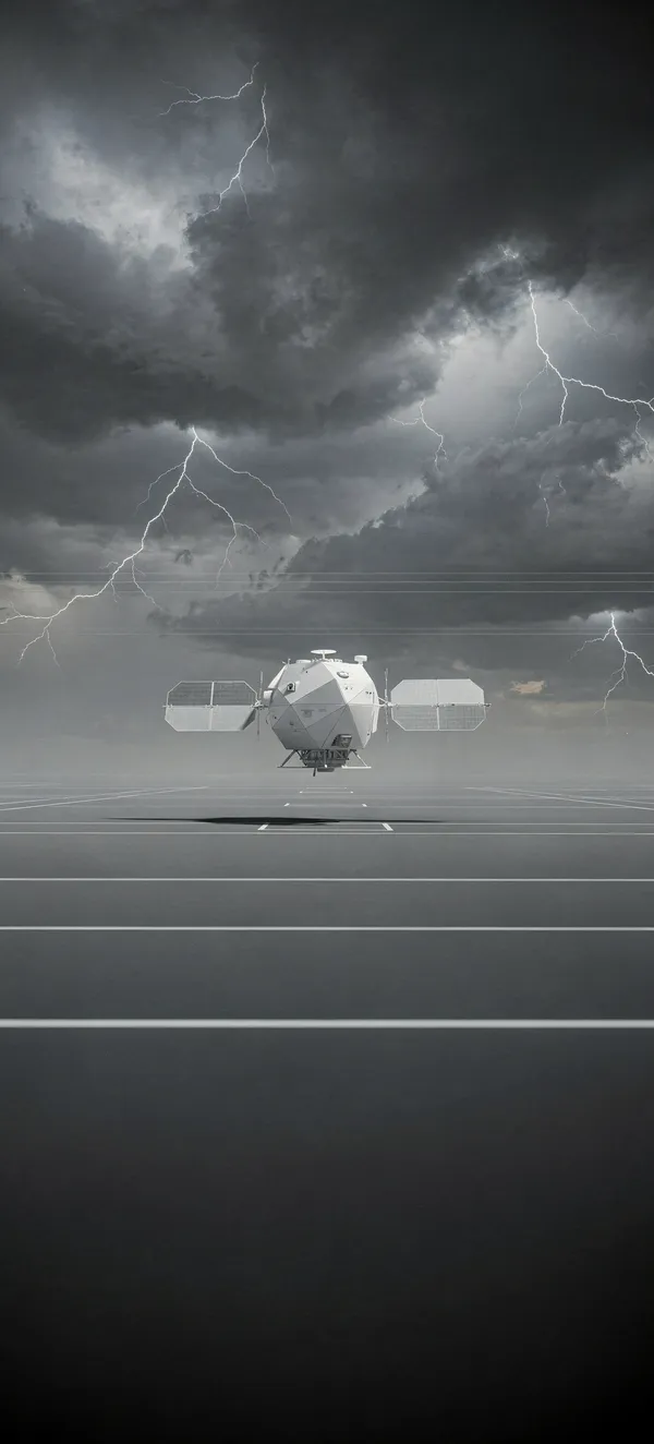 SpaceUltra-clean scientific space wallpaper featuring a sleek white research satellite against a dramatic charcoal cosmic backdrop. High-resolution 4K design for phone screens.