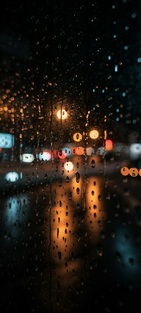 Dark / AMOLEDUltra-dark macro photography wallpaper featuring rain drops on glass with blurred orange city lights, perfect AMOLED black background for phone screens.