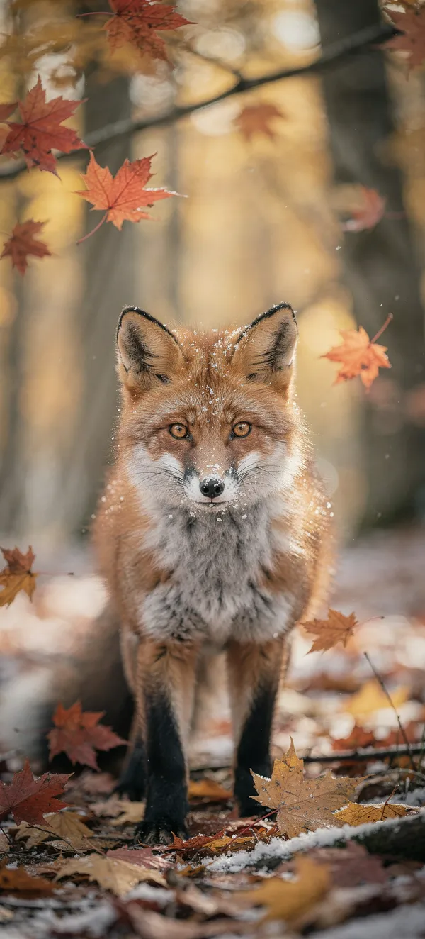 Stunning high-resolution wildlife phone wallpaper featuring a red fox in a golden autumn forest with soft snowfall and vibrant orange eyes. Perfect nature background.