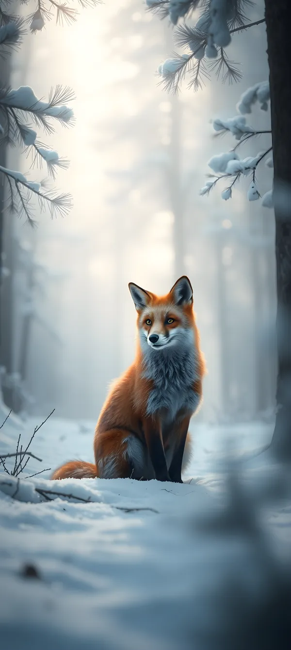 Stunning high-resolution winter wildlife wallpaper featuring a curious red fox in a snowy forest with soft morning light and intricate frost details.