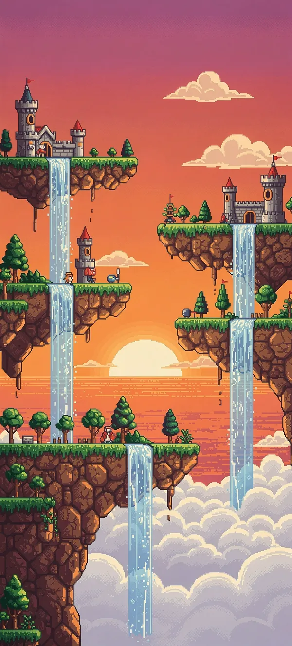 GamingImmersive 16-bit pixel art landscape wallpaper with floating islands, vibrant sunset gradient, and classic gaming aesthetic perfect for mobile backgrounds.