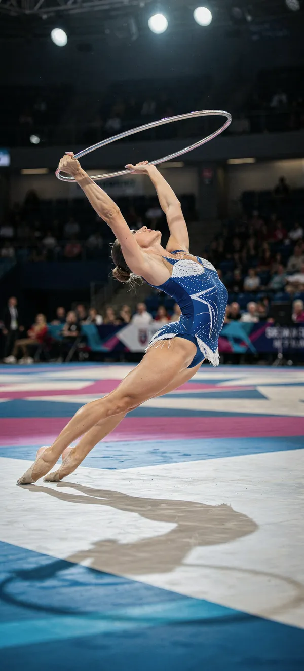 SportsHigh-resolution phone wallpaper featuring an elite rhythmic gymnast performing with a hoop, showcasing incredible flexibility and athletic precision in stunning arena lighting.