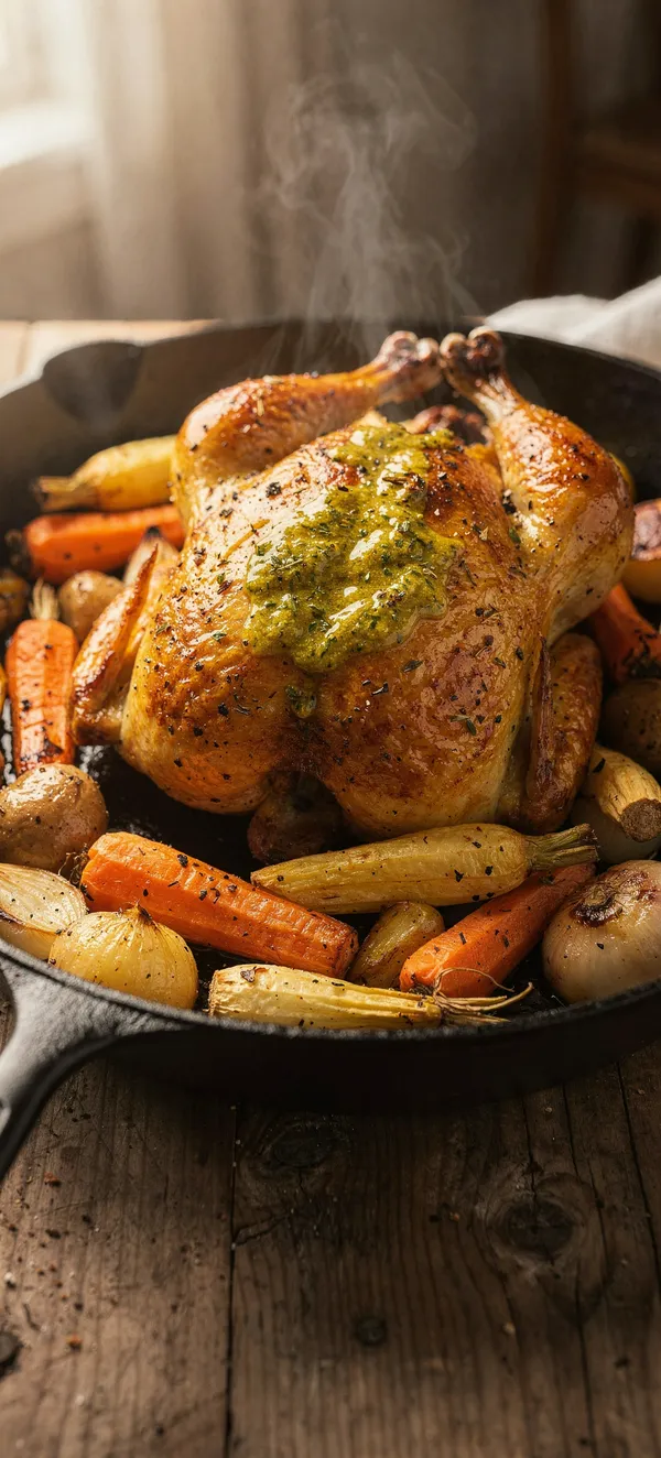 FoodDelectable whole roasted chicken with crispy golden skin and herbs, surrounded by rustic root vegetables in a warm, appetizing kitchen scene. HD food wallpaper.