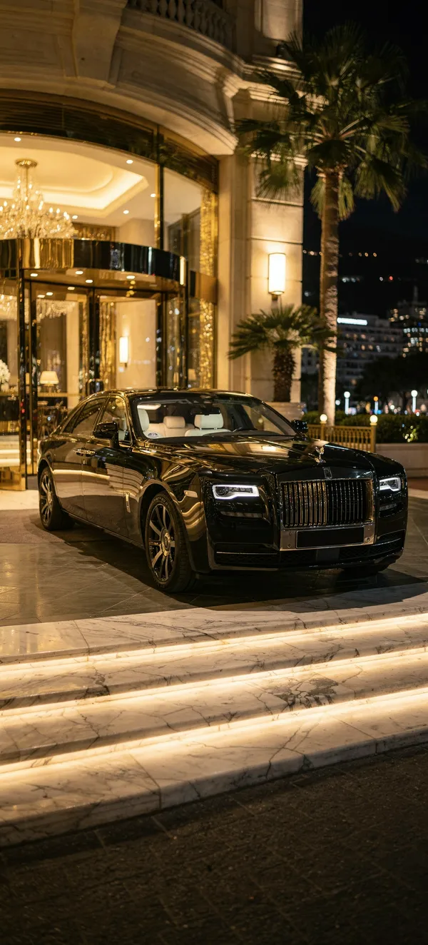 Stunning black luxury car wallpaper featuring a Rolls-Royce Ghost at a Monaco hotel entrance with golden lights and elegant nighttime atmosphere.