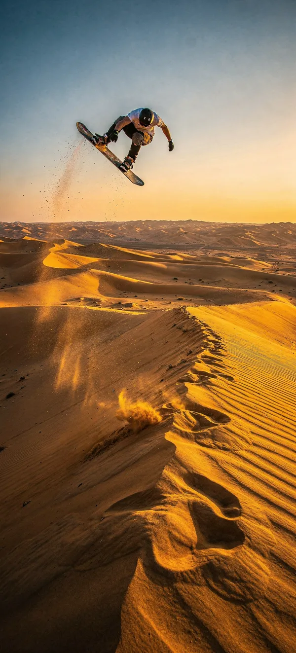 SportsExtreme sports wallpaper featuring an epic sandboarding rider launching off a golden desert dune. High-resolution mobile background for adventure enthusiasts.