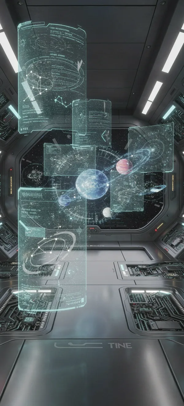SpaceImmersive 4K phone wallpaper featuring an ultra-detailed spacecraft interior with holographic navigation, cyan digital displays, and ethereal technological design.
