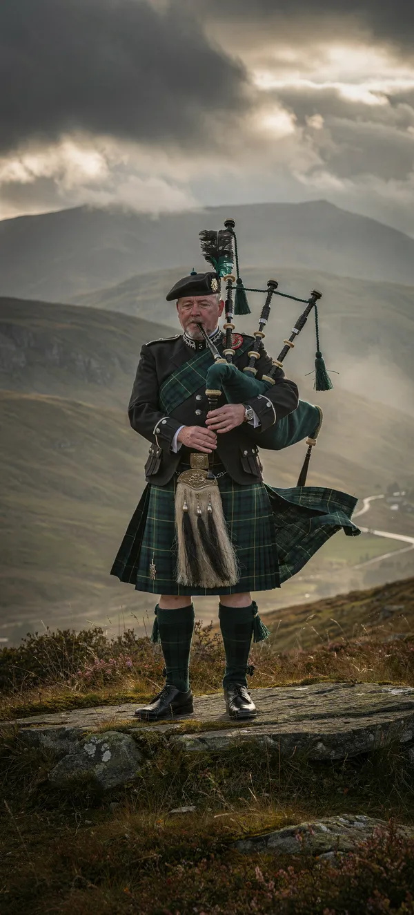 Stunning traditional Scottish piper in full regalia against misty mountain landscape. High-quality cultural heritage mobile background in atmospheric green and grey tones.