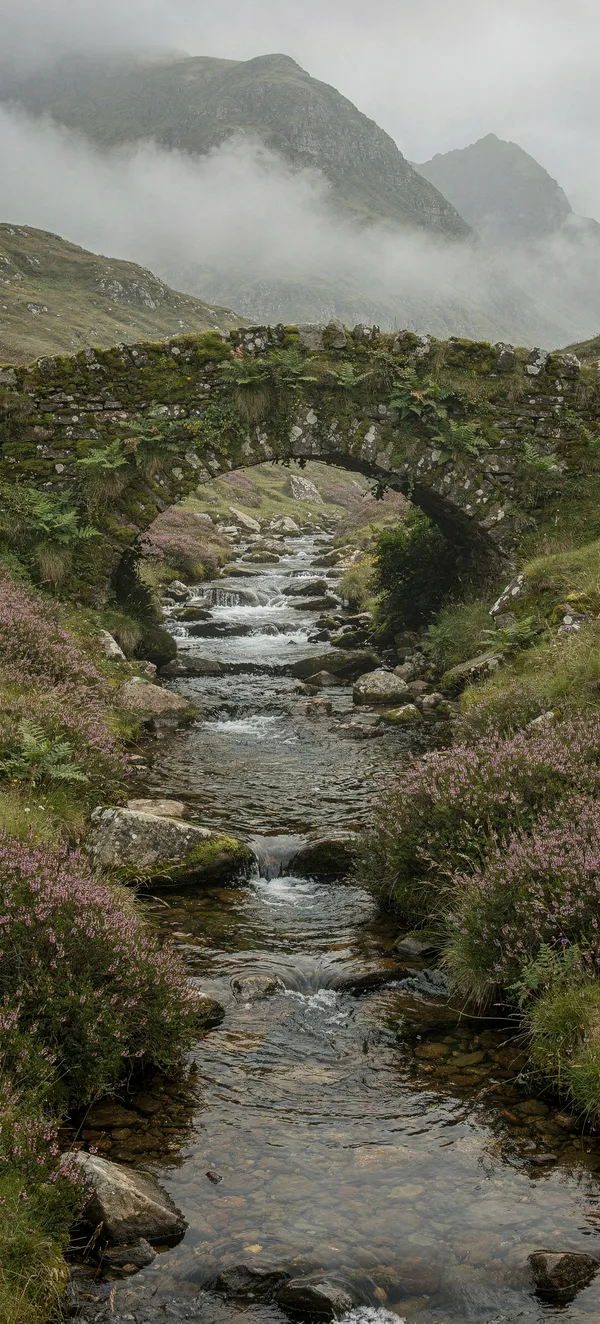 NatureImmersive Scottish highlands wallpaper featuring a misty mossy stone bridge over a dark peaty stream, with purple heather and atmospheric mountain backdrop in stunning HD quality.