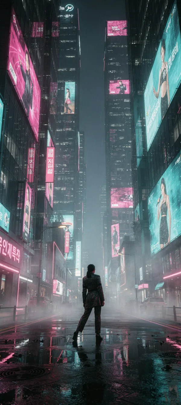 Immersive vertical 4K phone wallpaper featuring a cinematic Seoul night scene with neon lights, holographic billboards, and a solitary K-pop silhouette in stunning urban detail.