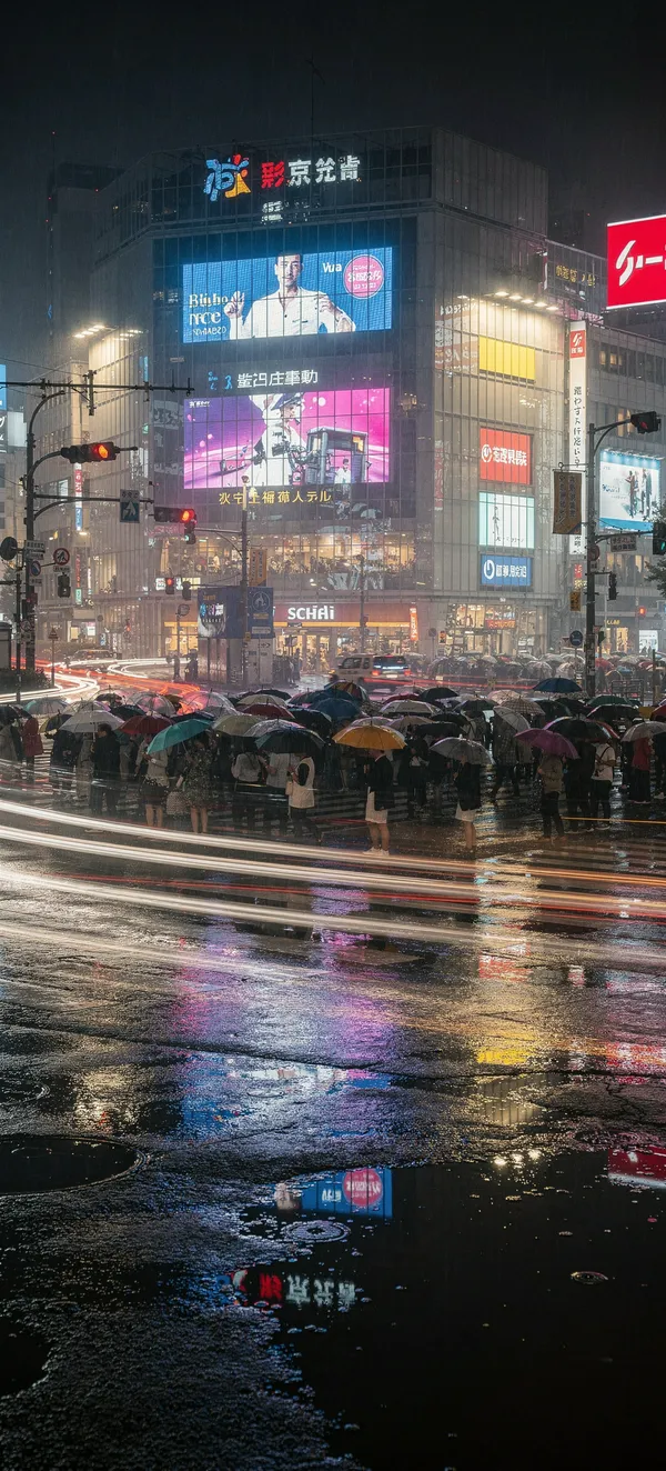 CityImmersive Tokyo cityscape wallpaper featuring Shibuya crossing at night with neon reflections, rainy streets, and urban energy. High-resolution urban photography.