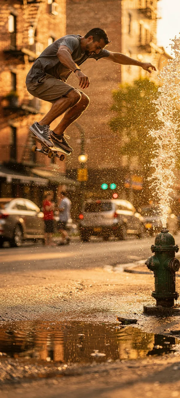 PeopleCapture the vibrant energy of summer with this high-resolution HD wallpaper featuring an epic skateboard ollie over a sparkling water spray in golden sunlight.