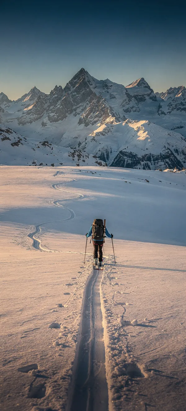 SportsStunning backcountry skiing wallpaper featuring pristine mountain slope, fresh powder, and epic alpine panorama. High-resolution winter sports background.