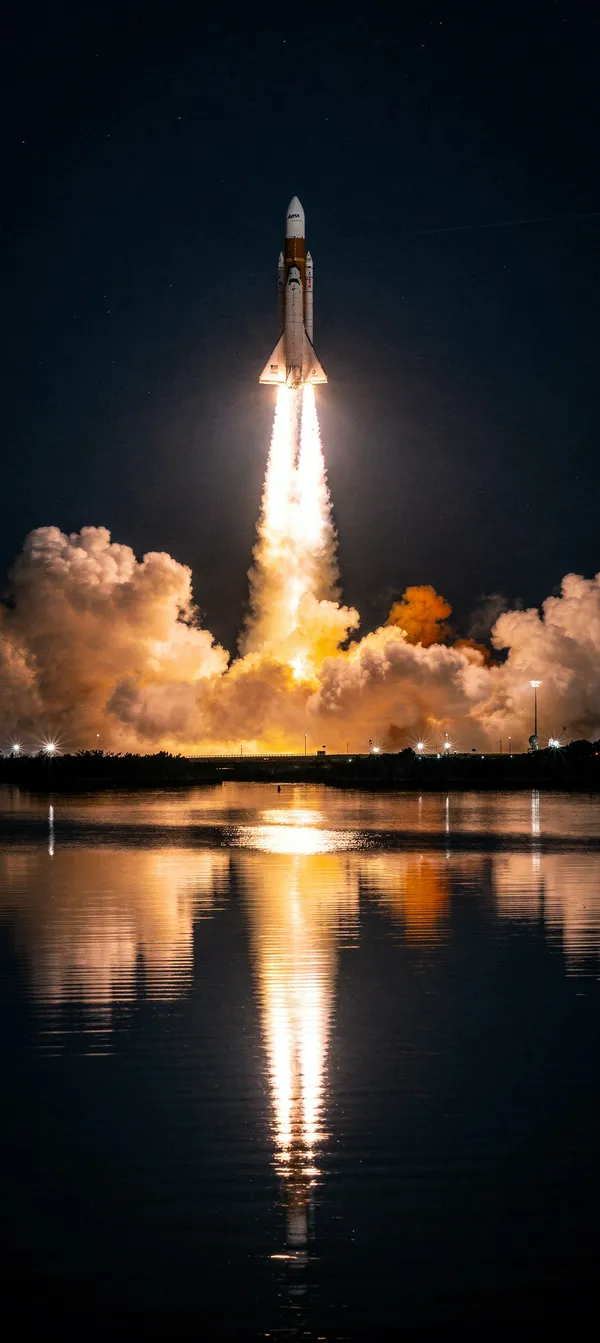 SpaceStunning 4K phone wallpaper of SLS rocket launch with vibrant orange exhaust reflecting in water at Kennedy Space Center, long exposure night photography.