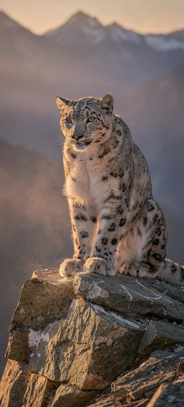 AnimalsHigh-resolution wildlife phone wallpaper featuring a stunning snow leopard perched on a rocky cliff, bathed in golden sunset light with dramatic mountain background.