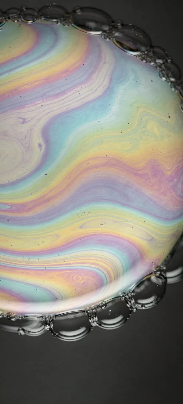 Mesmerizing microscopic abstract wallpaper featuring iridescent soap bubble film with swirling rainbow colors and organic interference patterns in high resolution.