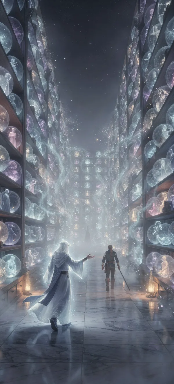 Immersive fantasy RPG wallpaper featuring ethereal soul archive with glowing orbs and spirit guide. High-resolution gaming background for mobile.