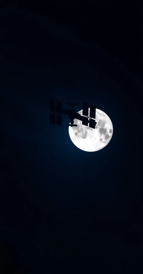 International Space Station silhouette crossing in front of full moon, night sky, photorealistic astrophotography, 4K phone wallpaper