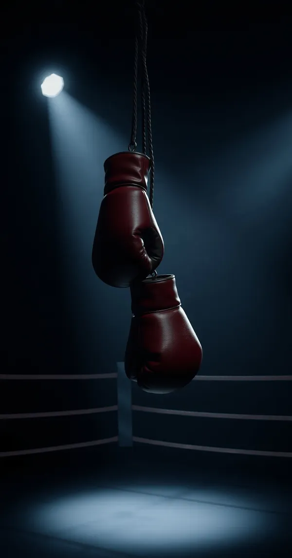 SportsBoxing gloves hanging on ring ropes in empty dark arena, dramatic spotlight, gritty atmosphere, photorealistic, 4K phone wallpaper