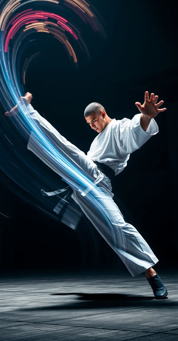 Martial artist performing spinning kick with motion trails, dark dojo, dramatic side lighting, photorealistic, 4K phone wallpaper