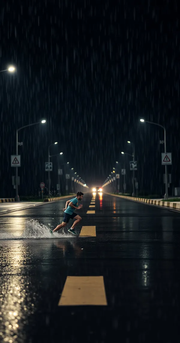 Runner sprinting through rain on empty road at night, water splashing, street lights reflecting, photorealistic, 4K phone wallpaper