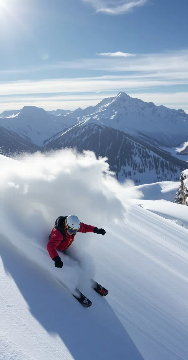 SportsSkier carving through deep powder snow, mountain backdrop, snow spray catching sunlight, photorealistic action photography, 4K phone wallpaper