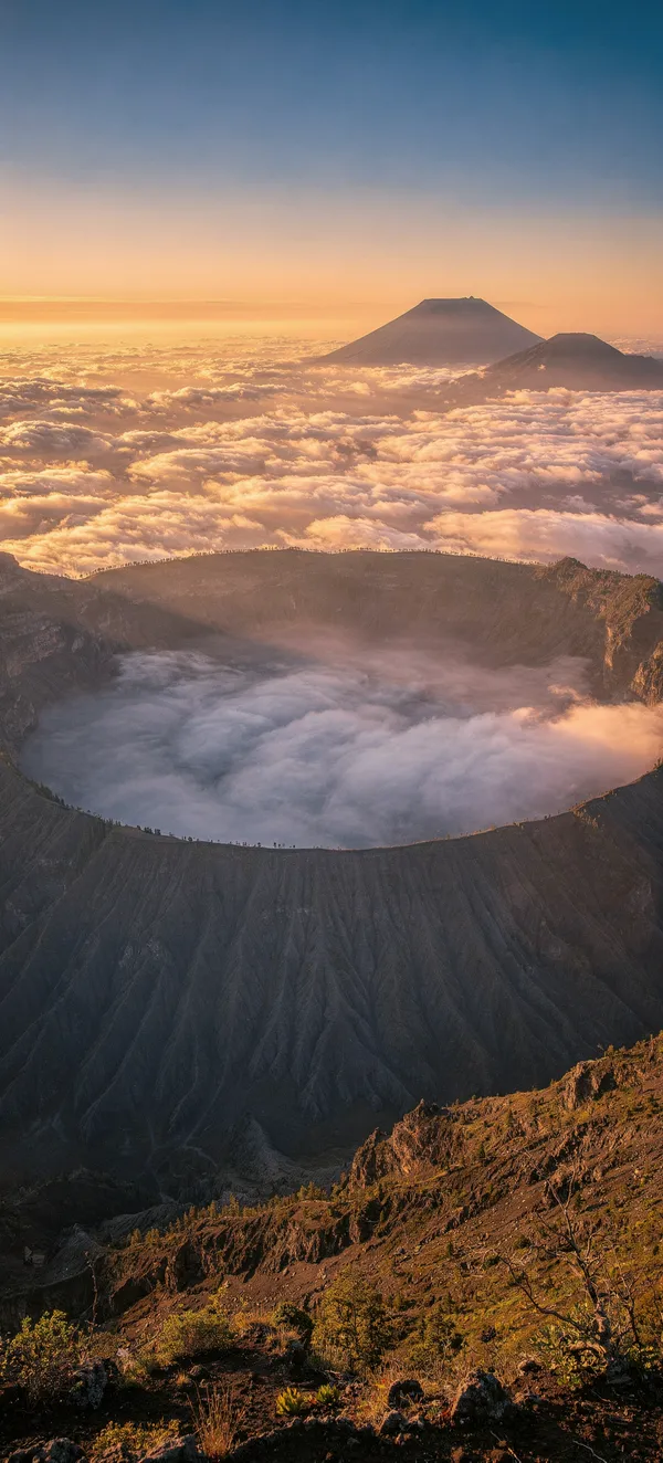 Breathtaking 4K phone wallpaper featuring a dramatic sunrise over a volcanic caldera with golden clouds and shadowy crater walls, perfect for nature lovers.