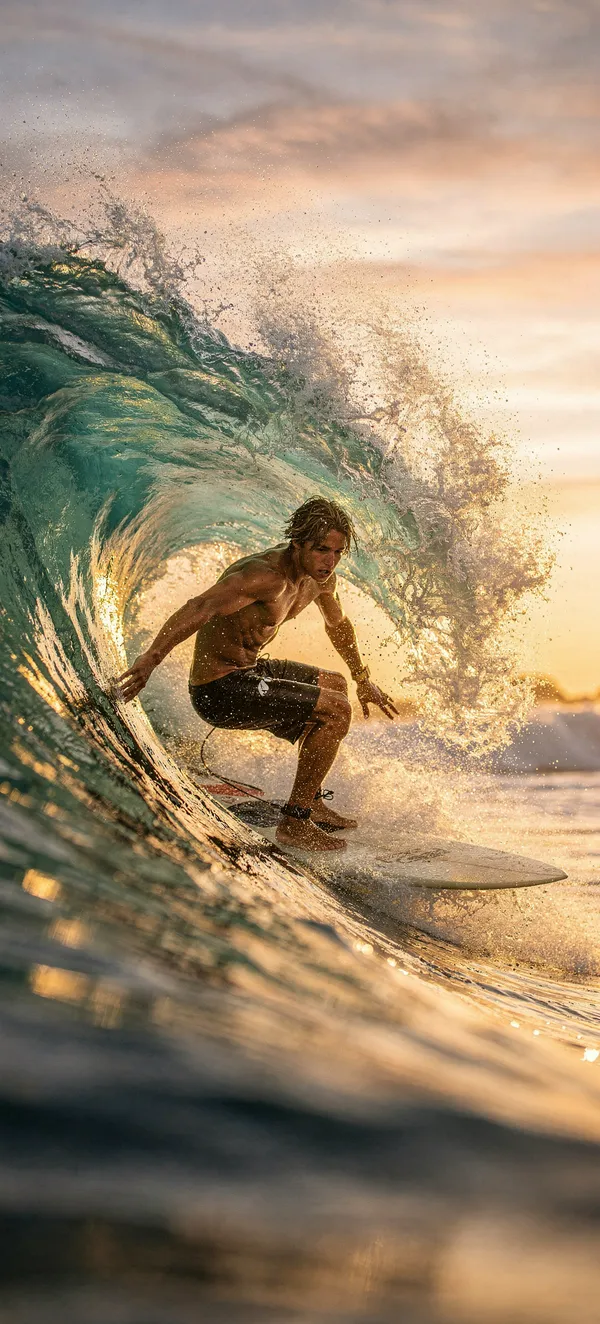 Dynamic ocean wallpaper featuring a young surfer riding a turquoise wave at golden sunrise, capturing fluid motion and tropical ocean colors in stunning HD quality.
