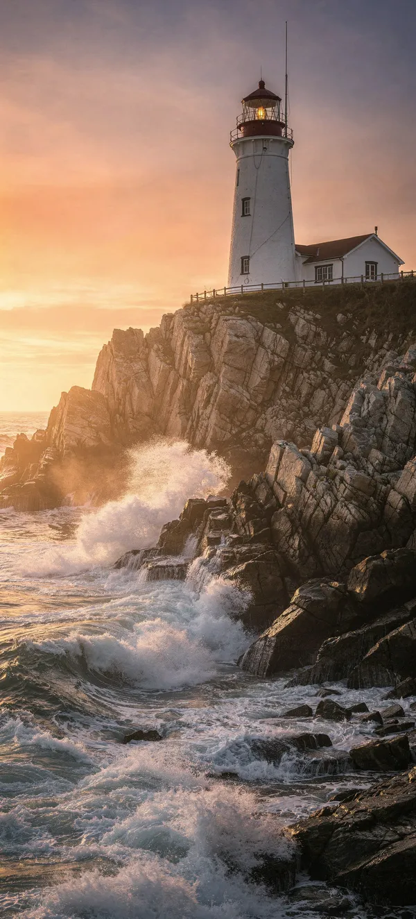 SunsetsStunning photorealistic wallpaper of a lighthouse on rocky cliffs with vibrant orange sunset sky and crashing waves. High-quality mobile background.