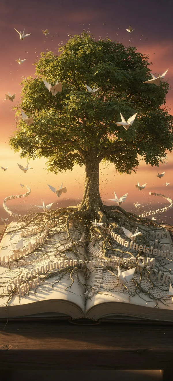 ArtEnchanting surreal wallpaper featuring a mystical tree growing from an open book with letter roots, golden sunset sky, and floating paper birds. High-quality art design.