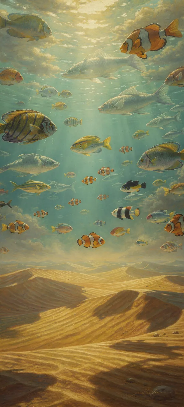 ArtDreamy artistic wallpaper featuring tropical fish swimming through an amber desert sky, unique surrealist landscape with inverted ecosystem design for mobile screens.