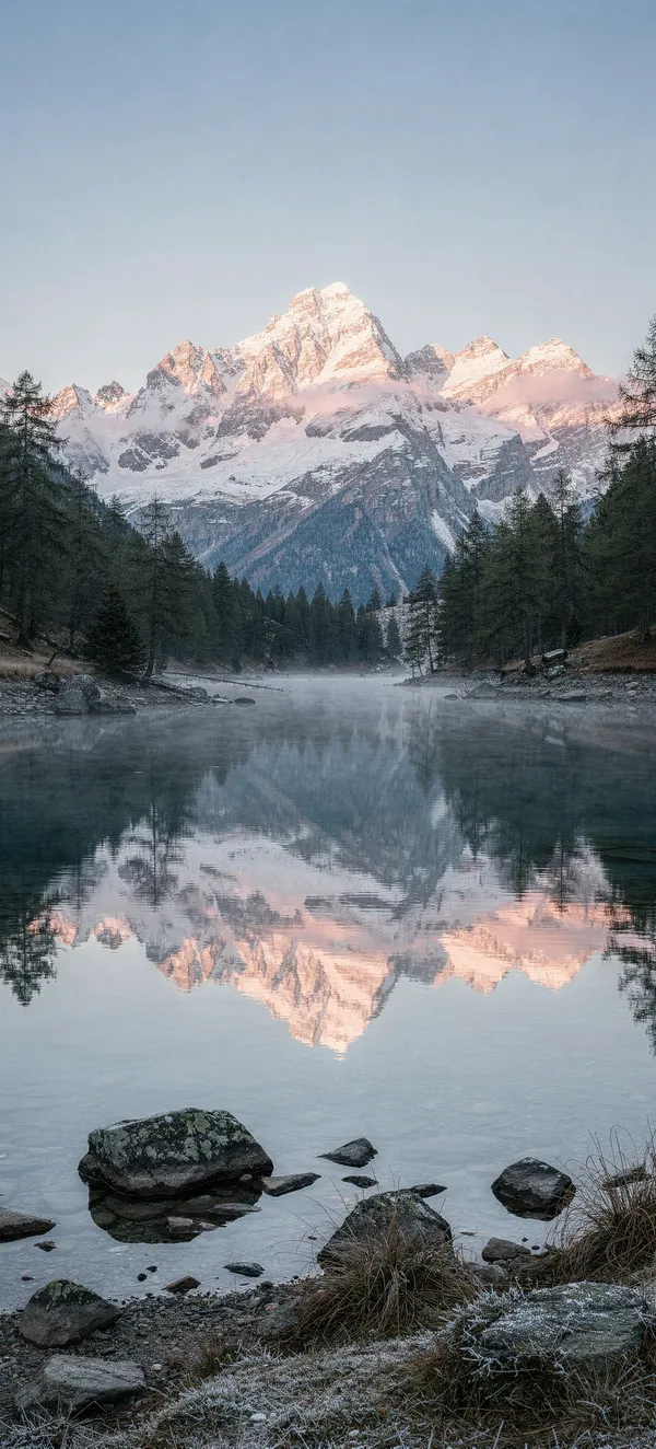 NatureStunning high-resolution phone wallpaper featuring snow-capped Alpine peaks reflecting in a tranquil mountain lake with soft pink morning light.