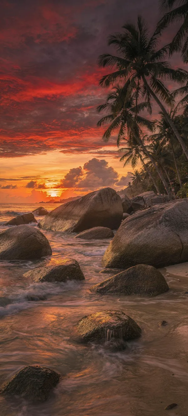 Breathtaking long exposure Thailand beach wallpaper featuring dramatic sunset colors, rocky shoreline, and serene ocean waves with palm trees.