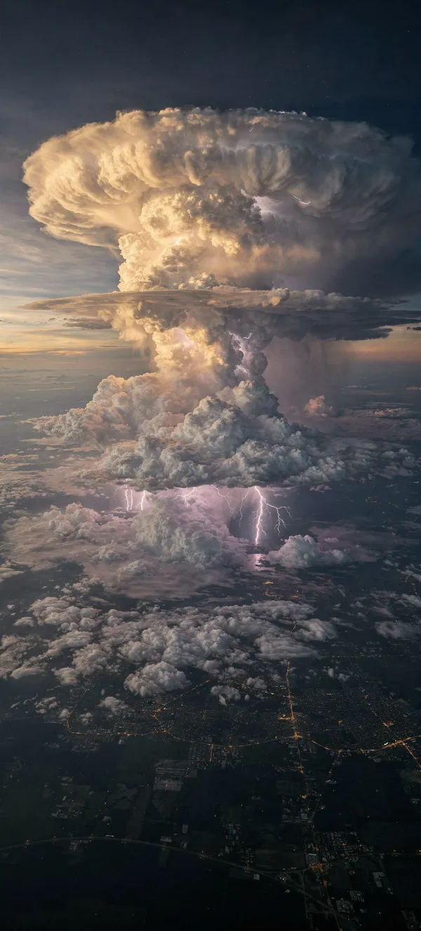 NatureDramatic high-altitude thunderstorm wallpaper with golden sunset light, massive cloud system, and spectacular lightning strike. Perfect HD nature background.