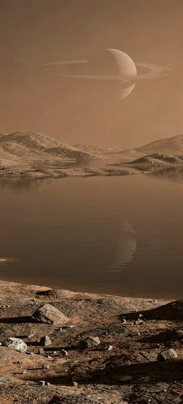 Immersive 4K phone wallpaper featuring a stunning, photorealistic landscape of Titan's dark methane lake with Saturn's misty silhouette in the background.