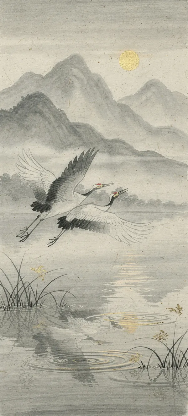 Elegant traditional Japanese ink-wash anime landscape wallpaper featuring golden cranes over misty mountain lake. High-quality artistic phone background in soft grays and gold.