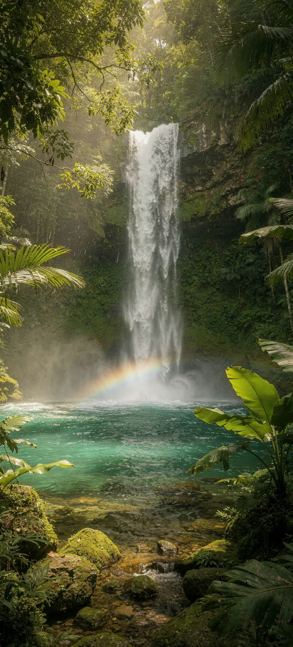 NatureStunning high-resolution nature wallpaper featuring an emerald waterfall cascading through a vibrant tropical jungle with sun rays and rainbow mist.