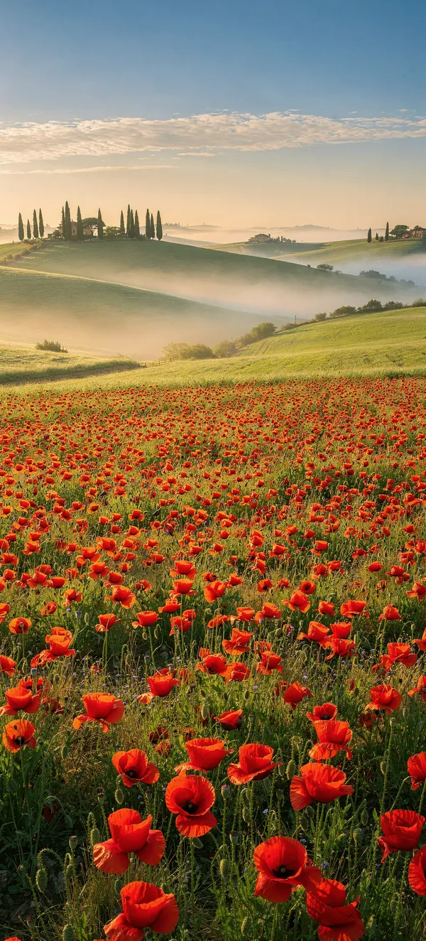 Vibrant red poppy landscape in Tuscany with rolling green hills, cypress trees, and soft morning mist. High-resolution nature wallpaper for mobile devices.
