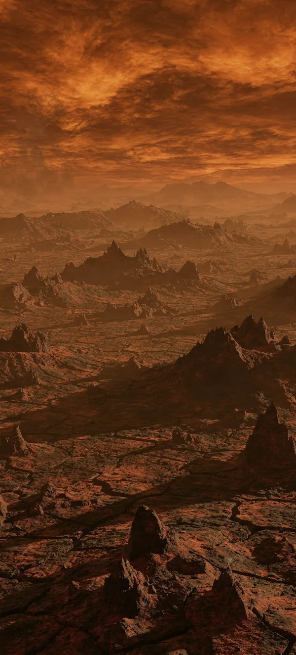 Explore a photorealistic Venus surface wallpaper with sharp volcanic rocks and a scorching orange sky. High-quality space landscape phone background.