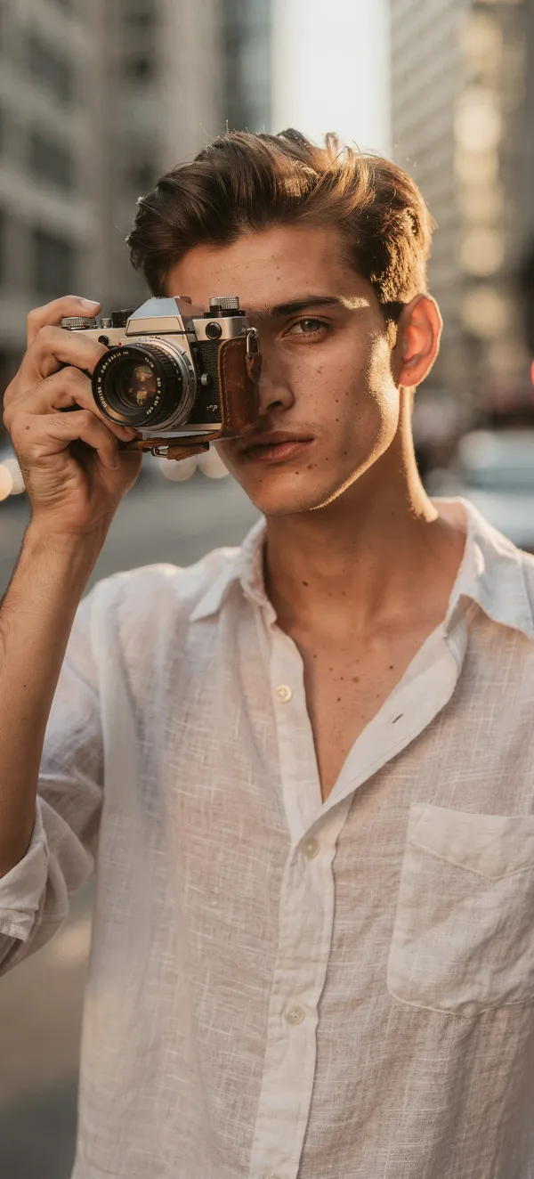 PeopleBeautiful creative portrait of a young man with a film camera, soft urban background in warm afternoon light. High-quality HD mobile wallpaper.