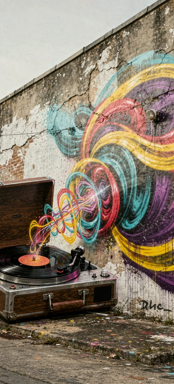 ArtImmersive street art wallpaper featuring a vintage record player with vibrant sound wave visualizations in a stunning rainbow psychedelic design, perfect for music lovers.