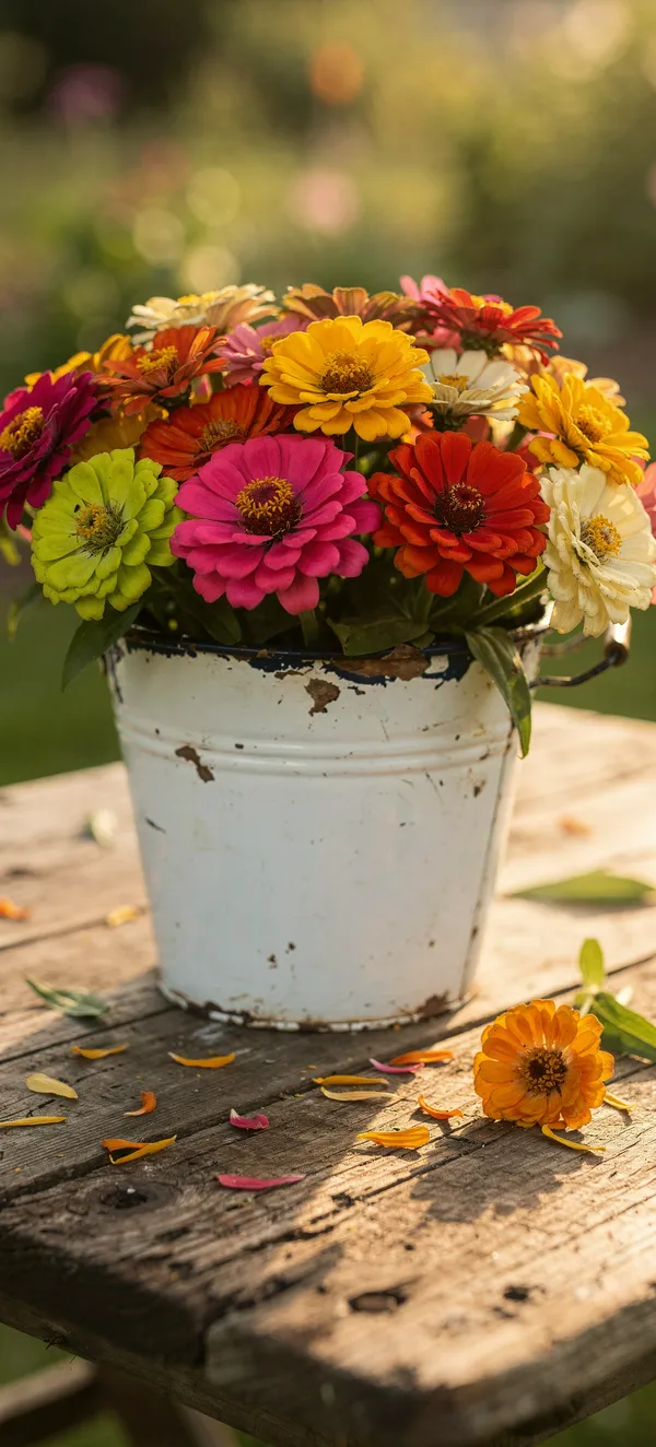 FlowersBeautiful vintage floral wallpaper featuring vibrant zinnias in a rustic enamel bucket, perfect summer garden scene in soft afternoon light for phone backgrounds.