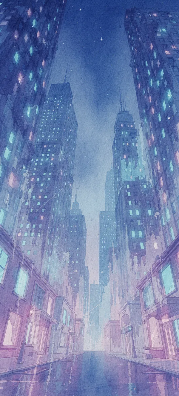 CityEthereal urban landscape wallpaper with soft watercolor skyscrapers in neon blues and purples, capturing minimalist city tranquility in high-resolution detail.