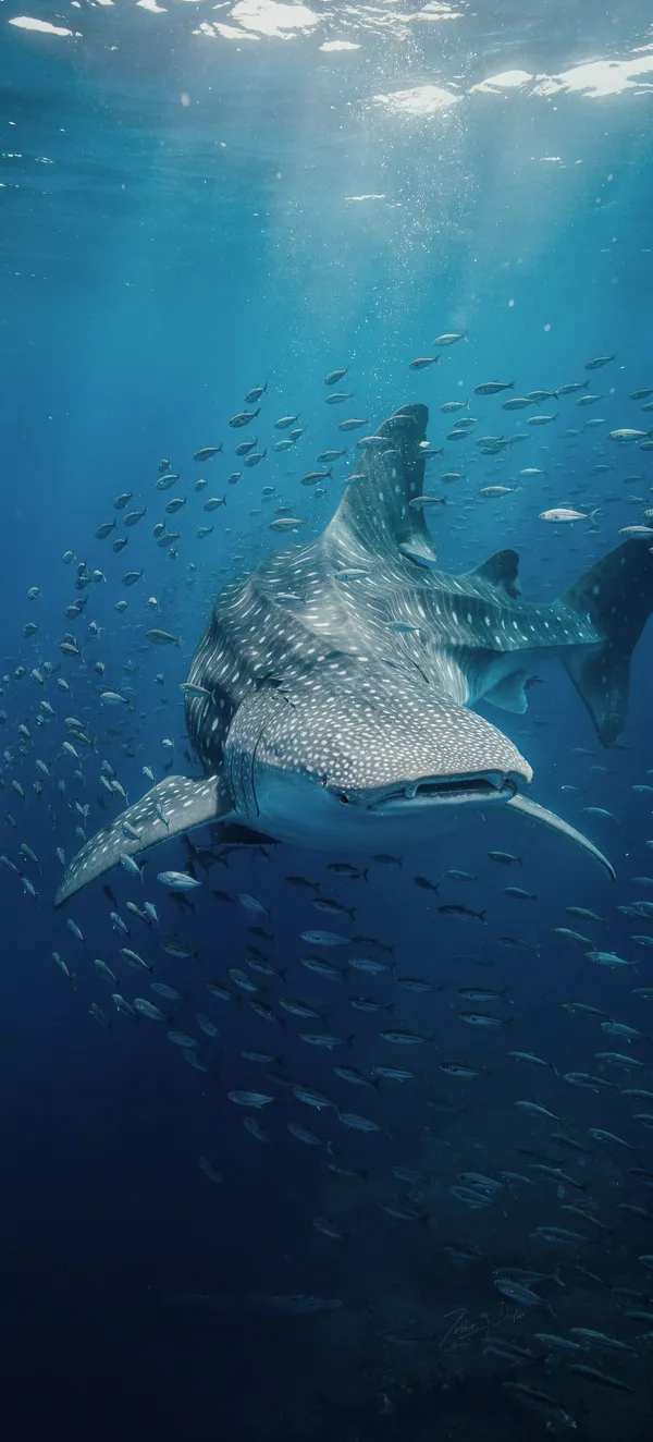 AnimalsStunning marine life phone wallpaper featuring a giant whale shark swimming through ethereal blue ocean waters with surrounding small fish. High-resolution marine scene.